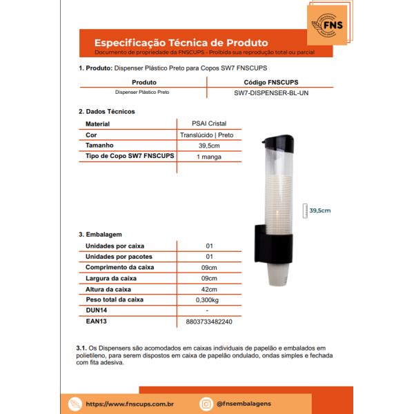 Dispenser FNS Plástico para Copo de Papel Preto 1 UN